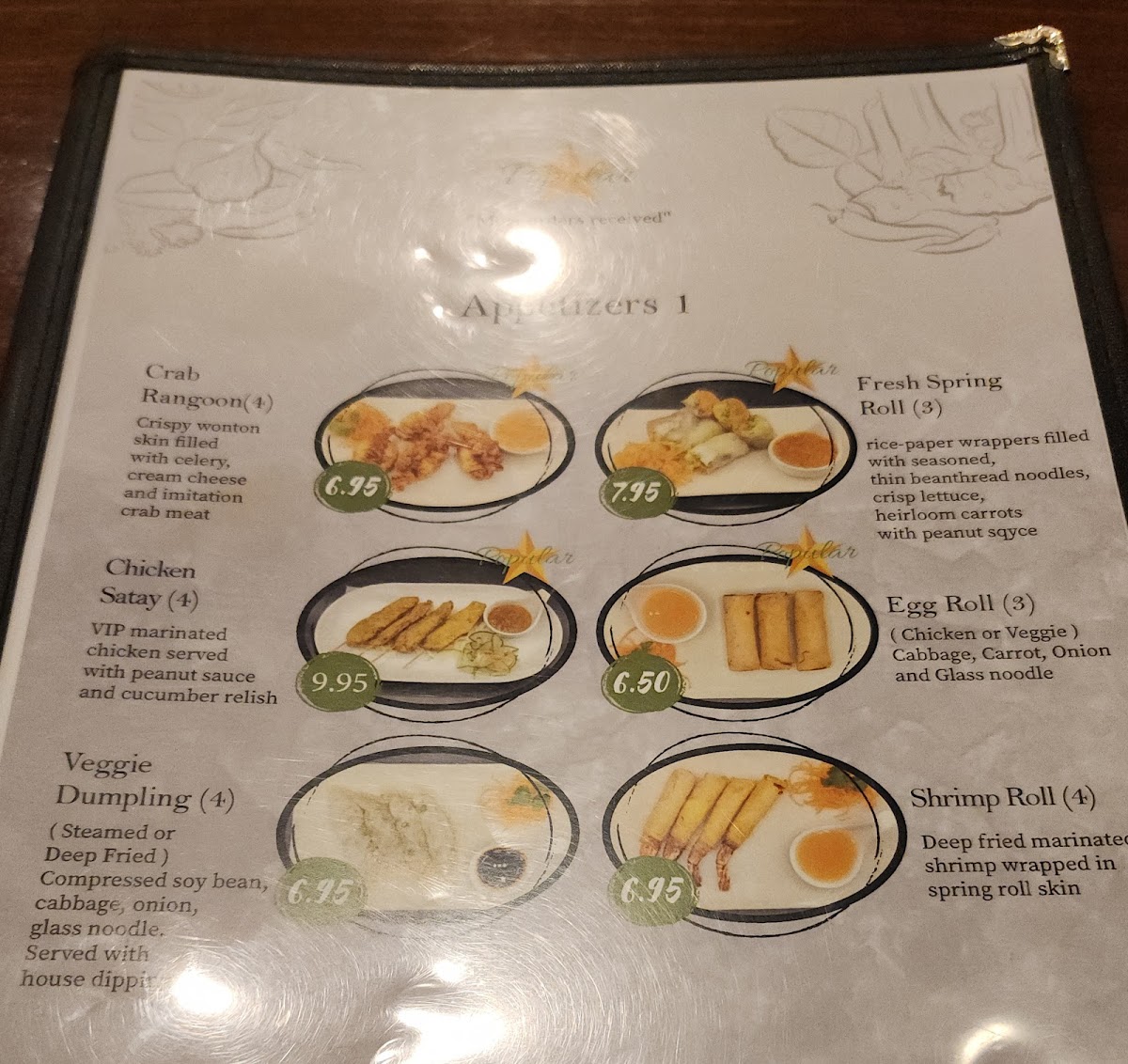 Crab rangoon, goyza, shumai, egg rolls and veggie dumplings.