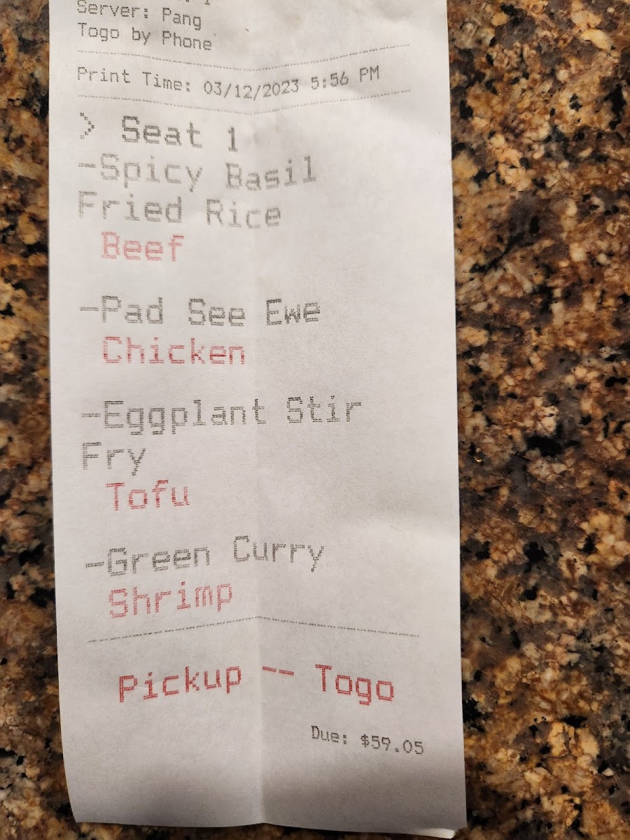 Spicy. With coconut milk, bell pepper, bamboo shoot, peas, and basil leaves. Served with steamed rice.